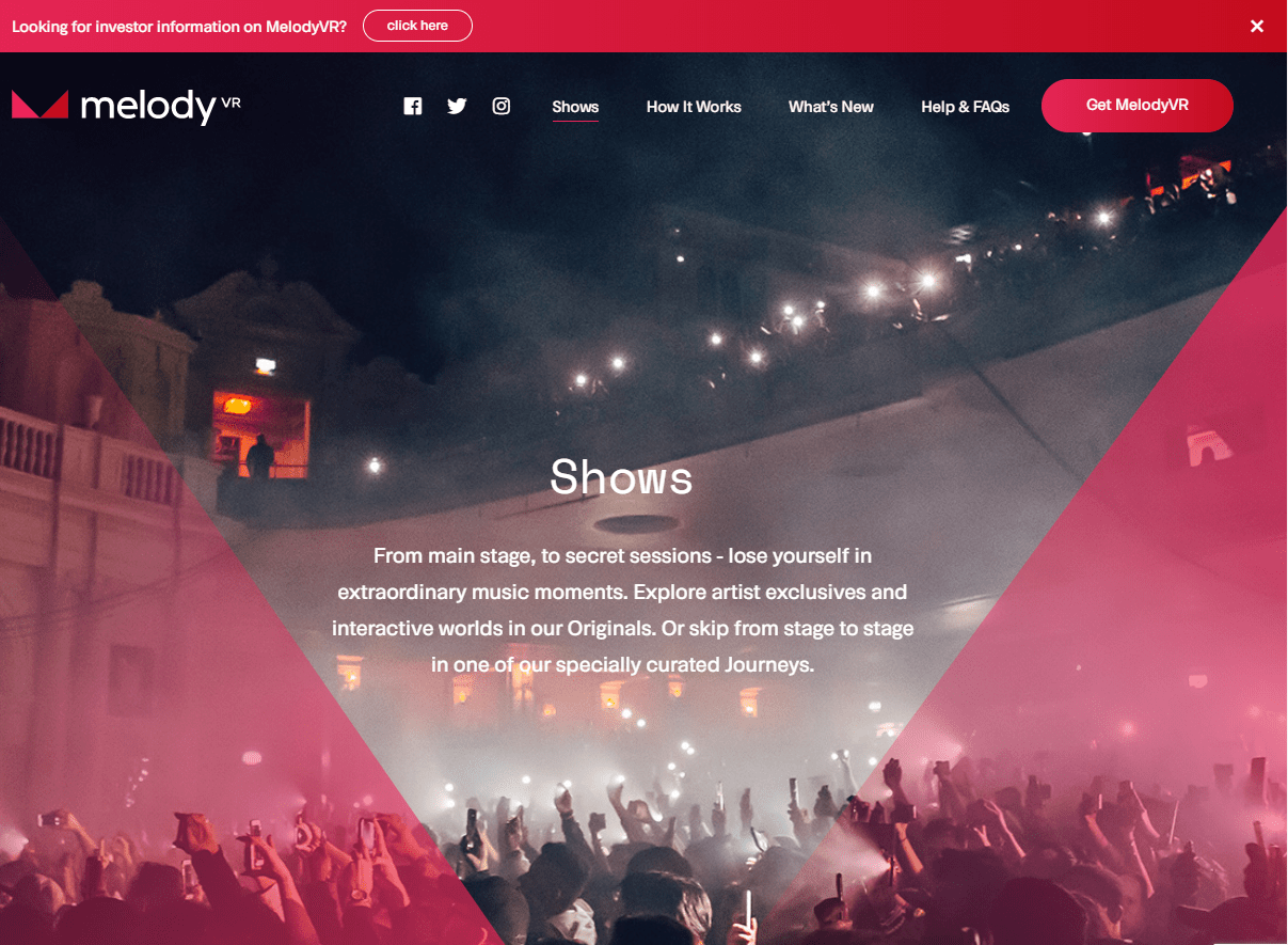 MelodyVR ofrece experiencias de realidad virtual en vivo de eventos deportivos y espectáculos de comedia, y el año pasado transmitió en vivo un concierto.